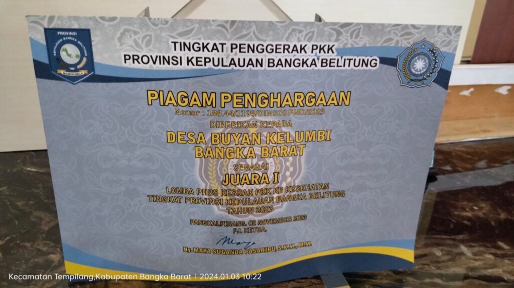Pangkalpinang, 02/11/2023. Desa Buyan Kelumbi, yang terletak di Kecamatan Tempilang, Kepulauan Bangka Belitung, meraih prestasi gemilang dengan meraih juara 1 dalam Lomba PHBS (Perilaku Hidup Bersih dan Sehat) KESRAK (Keluarga Sejahtera, Rukun, Aman, dan Kreatif) PKK KB Kesehatan tingkat Provinsi Kepulauan Bangka Belitung.